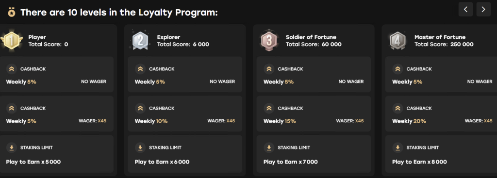 Programul de loialitate Fairspin este unul dintre cele mai transparente din industrie. Se bazează pe 10 niveluri clare, unde fiecare nivel oferă recompense progresiv mai bune.